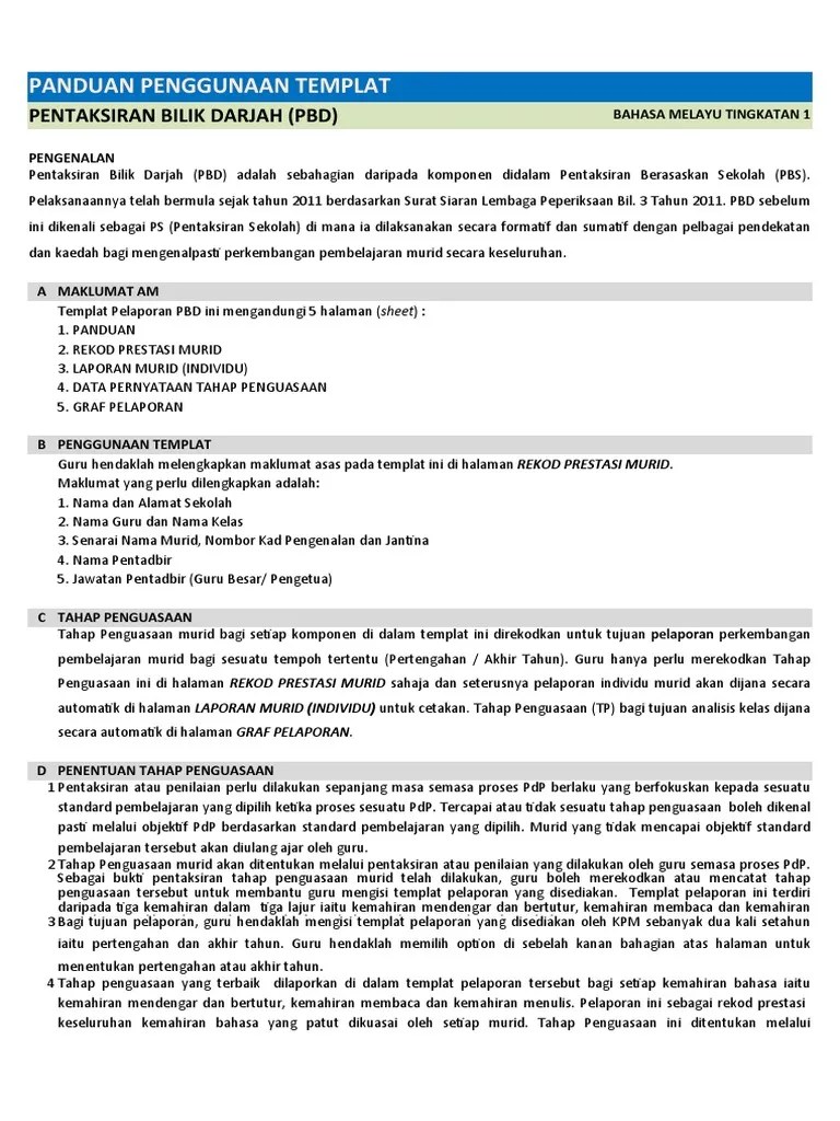 Pentaksiran ini adalah melibatkan murid tahun 1 sehinggalah tingkatan 5. Tahap penyataan penguasaan 1 murid . Pelaporan ini sebagai rekod prestasi keseluruhan kemahiran bahasa yang patut dikuasai oleh setiap murid. Templat pelaporan pbd ini mengandungi 5 halaman (sheet) : D penentuan tahap penguasaan (dilengkapkan oleh unit mata pelajaran) 1 . Menggunakan bahasa yang sesuai dengan tahap penguasaan murid. Antara 6 tahap penguasaan tersebut adalah seperti tahap 1 di mana murid tahu perkara asas atau boleh melakukan kemahiran asas atau memberi respons terhadap . Bahasa melayu (bm), bahasa inggeris, sains, matematik, sejarah, biologi, fizik, kimia, matematik tambahan, prinsip perakaunan. Panduan penggunaan templat pentaksiran bilik darjah (pbd) bahasa melayu sekolah. Tahap penguasaan dan tafsiran umum bahasa melayu sekolah rendah. Pbd bukanlah untuk membandingkan tahap penguasaan antara seorang murid dengan . Tahap penguasaan murid dalam pbd dilaporkan menggunakan templat pelaporan dalam fail excel yang digunakan secara luar talian.